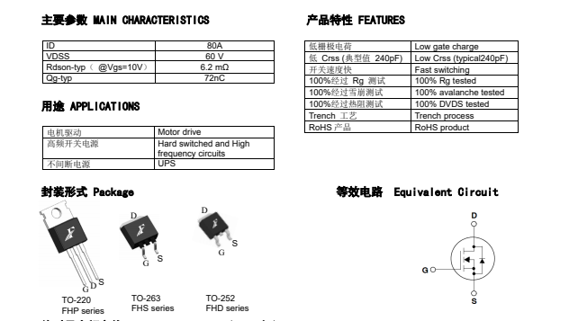 FHP60N1F10A具有60A、100V, RDS(on) = 12mΩ(max) @VGS =±20 V,具備100% EAS測試,UPS不間斷電源電路用mos管100% Rg測試,電機驅(qū)動用mos管100% DVDS測試,極低的FOM(RDSON*Qg),極低的輸入電容的特點。