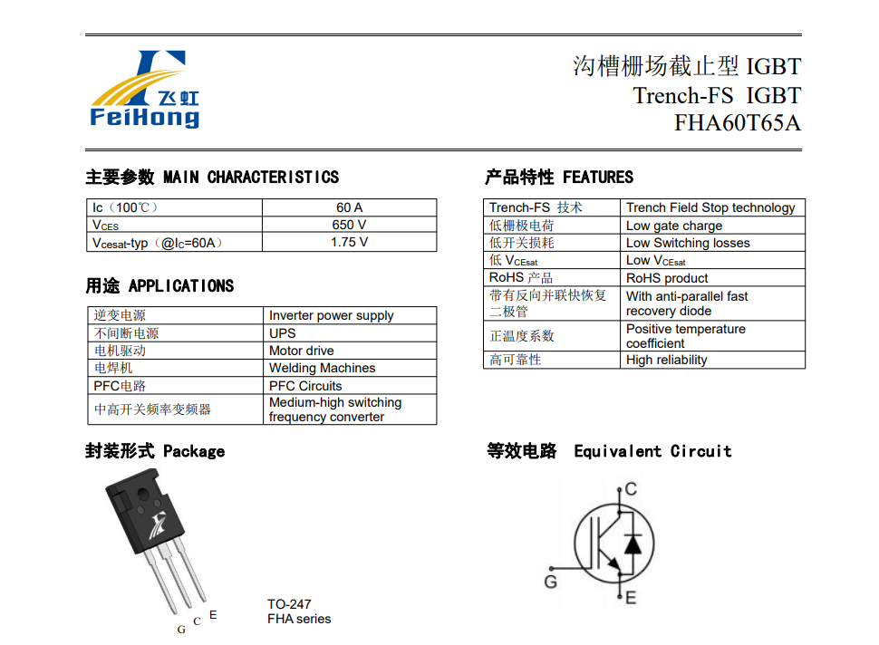 目前飛虹半導(dǎo)體的FHA60T65A型號(hào)IGBT產(chǎn)品參數(shù)特點(diǎn)為: