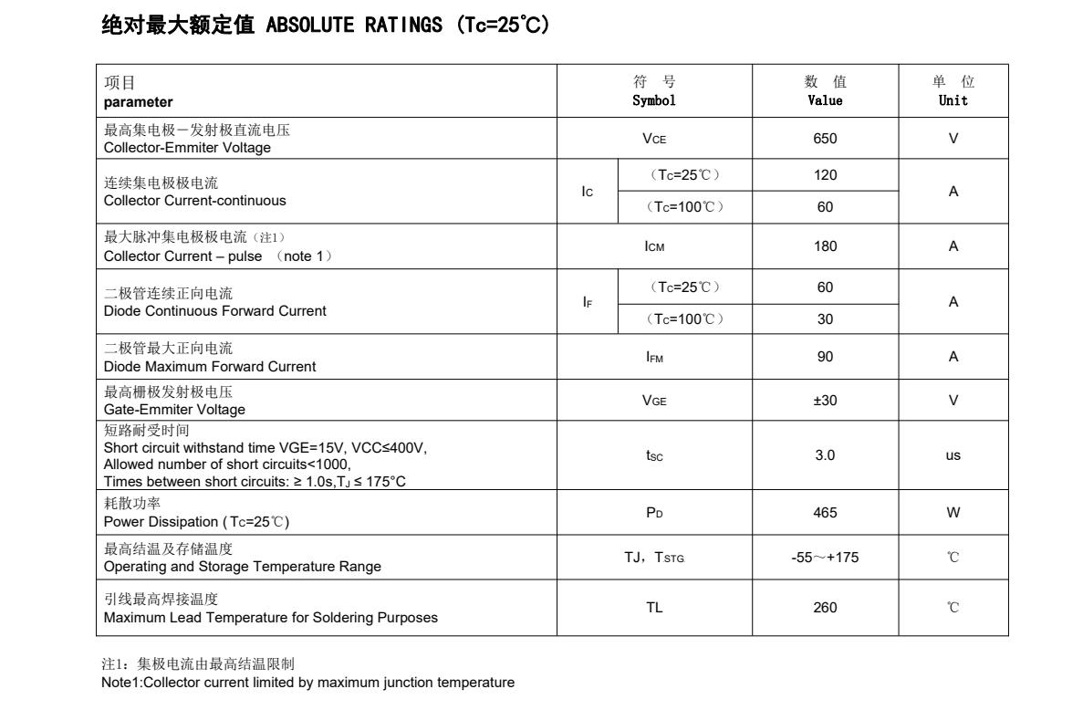 目前FHA60T65A詳細參數:其具有60A, 650V, VCEsat典型值:1.75V,<2.0V;IC (Tc=100℃):60A;Bvces:650V;IF (Tc=25℃):60A;IF (Tc=100℃):30A。